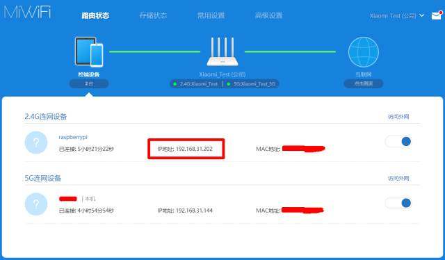 第一步:为树莓派连上路由器,并获取树莓派 IP 地址。最简单的方法是打开路由器后台,就可以看到树莓派的 IP 地址了。